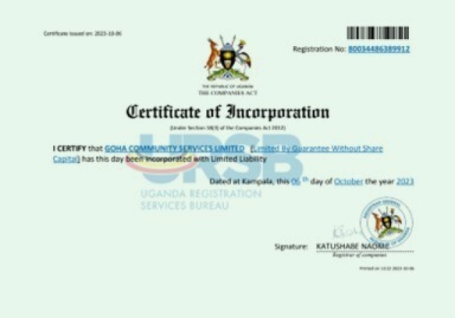 ➤ GOHA Registration Certificate GOHA Community Services Ltd is a legally registered non-governmental organization in Uganda. This certificate confirms its formal recognition by the national NGO coordination authority.